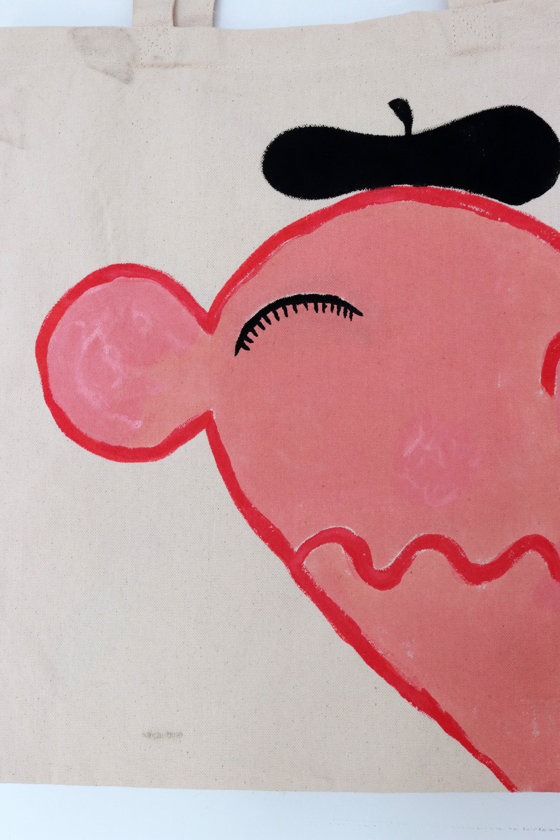 Tote Art son bolsas de algodón ecológico de 280 g/m2 pintadas a mano. Las medidas son 42 cm de alto por 38 cm de ancho, y las asas son de 65 cm. Cada bolsa es una obra de arte única. Preferiblemente no lavar.